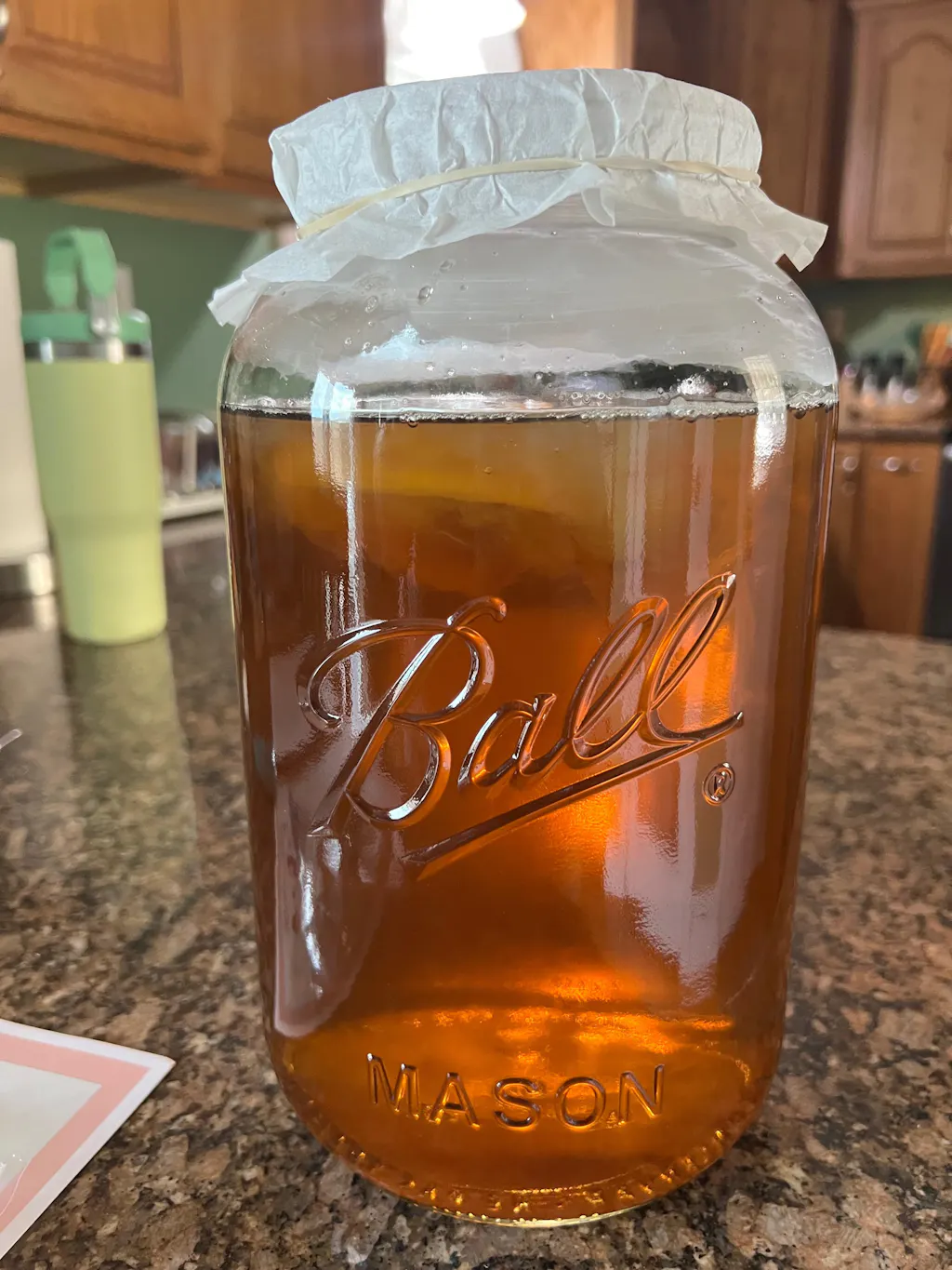 Add your cooled brew to your scoby and starter liquid. Cover with a piece of cloth (or kombucha.com Fer-Mesh) and an elastic band, then place in a well-ventilated area between 72-80 degrees. Do not place in direct sunlight.